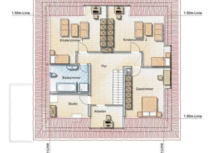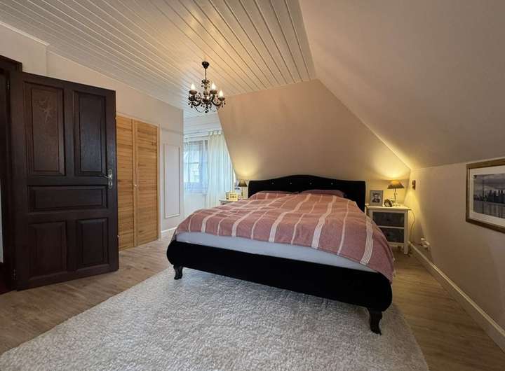 Die hochwertige Immobilie verfügt im Erdgeschoss über 1 Wohn-Esszimmer, 1 Elternschlafzimmer mit separatem Ankleidezimmer und einem direkten Zugang zum Badezimmer und eine in massivem Teakholz und hochwertigen E-Geräten ausgestattete Küche. Ein Hauswirtschaftsraum und ein Gäste-WC runden das Angebot im Erdgeschoss ab. Im Obergeschoss befinden sich drei weitere Schlafzimmer, ein Studio und ein Bad. Das Objekt ist komplett unterkellert. Zwei großzügige Garagen mit elektrischen Sektionaltoren bieten zusätzlich Unterstellmöglichkeiten für Pkw, Motorrad und Fahrrad.