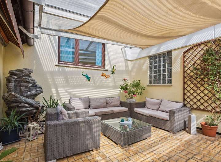 -Sehr schöne überdachte Dachterrasse (Verbindung Wohnhaus zu Anbau 1.OG 60m² derzeit Hobbyraum)