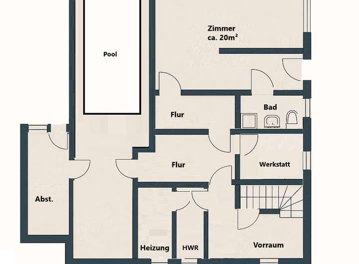 Im Untergeschoss erwartet Sie eine Einliegerwohnung mit separatem Eingang, sie bietet viel Stauraum, eine Küche, ein Badezimmer und ein Wohnzimmer, ideal für Gäste oder als zusätzlichen Wohnbereich, welcher sich optimal für Familien mit Kindern eignet. Außerdem finden Sie hier ein Schwimmbad, dass Raum für Weiterentwicklung bietet und mit etwas Kreativität in eine Wellness-Oase verwandelt werden kann.