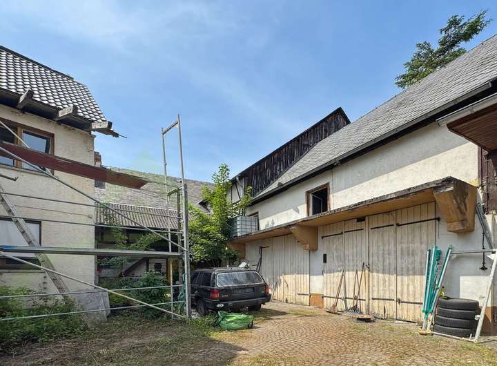 Besonders hervorzuheben ist die große Halle auf dem Grundstück, die sich ideal für handwerkliche, gewerbliche oder hobbymäßige Nutzung eignet. Auch im Außenbereich stehen ausreichend Stellplätze zur Verfügung. Der Gartenanteil lässt sich nach Wunsch gestalten.