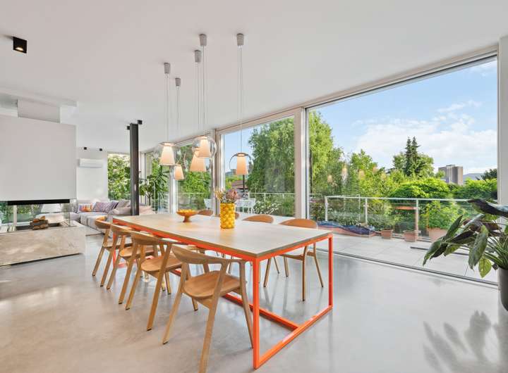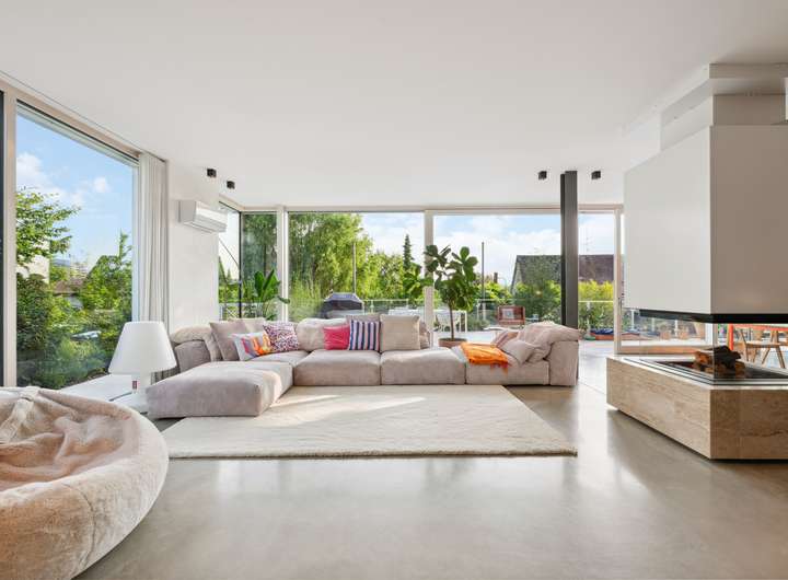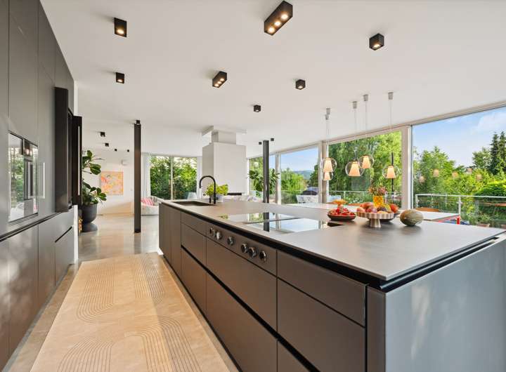Das riesige Wohnzimmer mit Kamin, offener Küche, raumhohen Fensterflächen und fast 3 m Deckenhöhe bildet das Herzstück. Offene Sichtachsen, eine hochwertige Leicht-Küche mit Gaggenau-Geräten und exklusive Materialkombinationen schaffen eine Atmosphäre, die begeistert – von Alltag bis Festlichkeit.