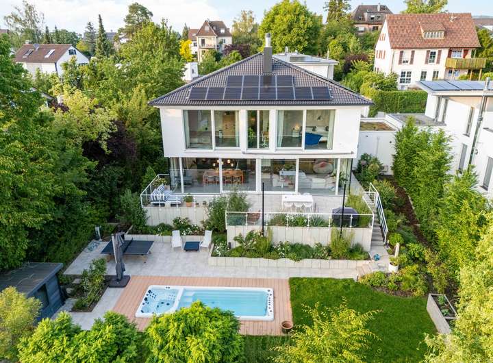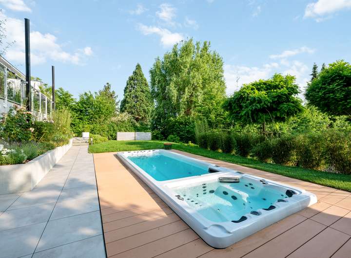 Draußen genießen Sie mit direktem Zugang aus dem Wohnbereich eine großzügige Terrasse, einen stilvoll angelegten Garten mit zahlreichen Pflanzen, Kräutern und Stauden, Privatsphäre und einen Pool mit Gegenstrom- und Whirlpoolfunktion. Alles ist so geplant, dass Wohnen, Entspannen und Genießen mühelos ineinandergreifen. Dieses Haus fühlt sich Tag für Tag wie Urlaub an.
