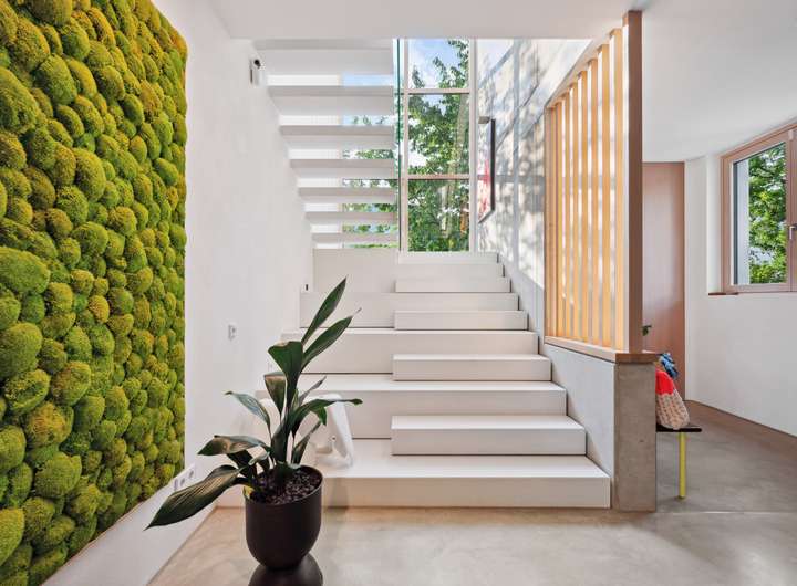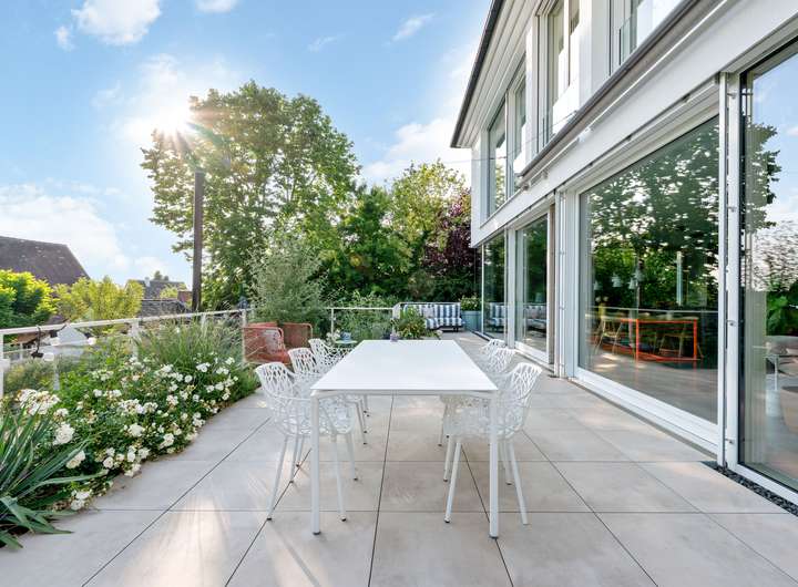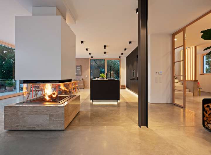 Sichtbeton-, Holz- und Natursteinelemente prägen das Qualitätsniveau dieser Stadtvilla und kreieren eine einzigartiges Ambiente voller Eleganz und Wärme und faszinierendem Licht.