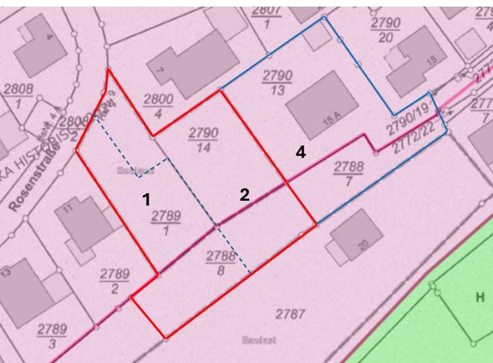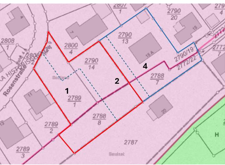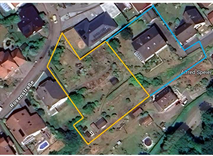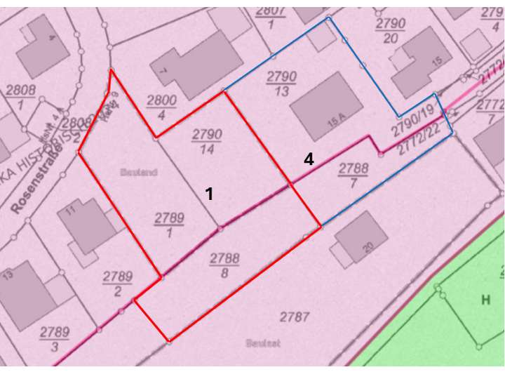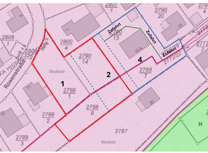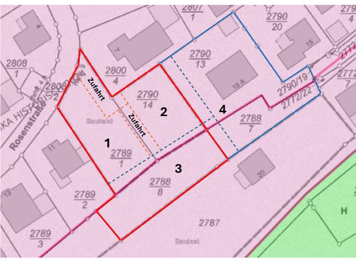 Bei Nutzung als Mehrgenerationenobjekt mit 2-Familienwohnhaus Zufahrtsmöglichkeiten über Rosenstrasse und Am Steinbruch.