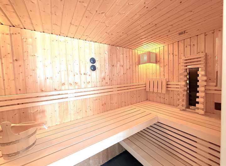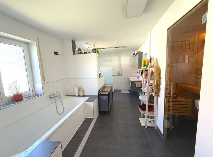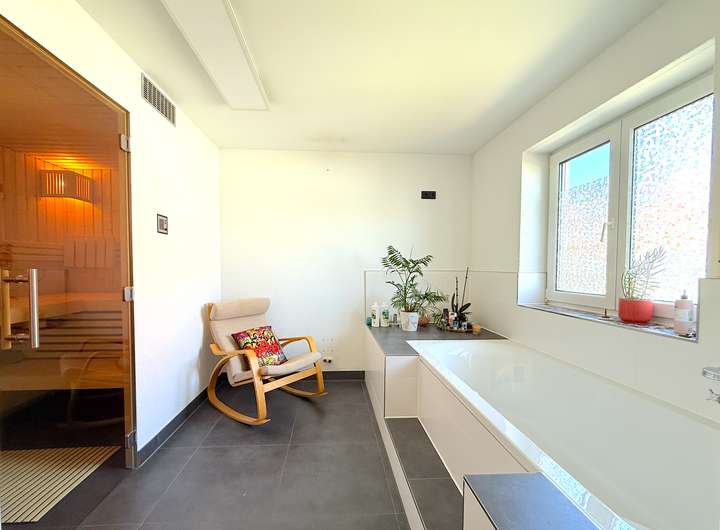 Das Highlight befindet sich im Obergeschoss: ein großzügiges Wellness-Badezimmer mit Badewanne, Dusche und integrierter Sauna – eine private Wohlfühloase, die den Alltag zum Luxusmoment macht.