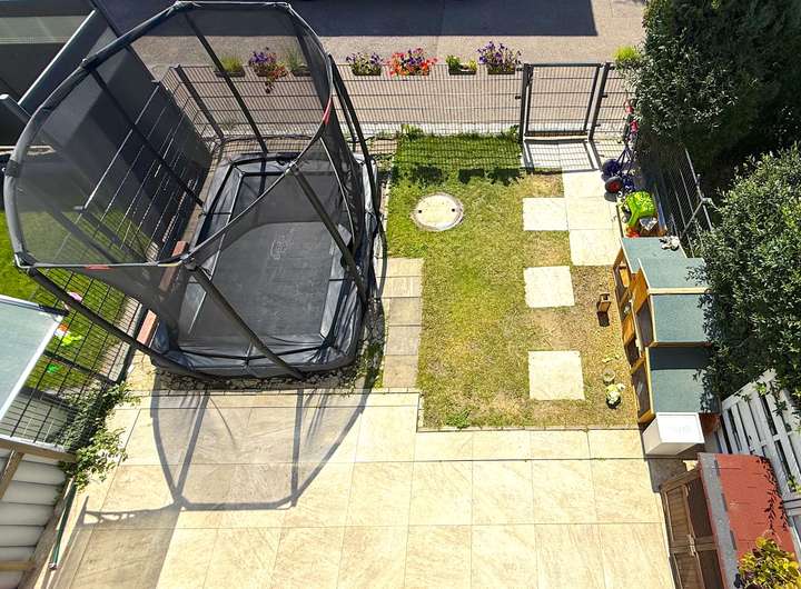Das Erdgeschoss präsentiert sich in offener Bauweise: Küche, Essbereich und Wohnzimmer verschmelzen zu einem großzügigen, lichtdurchfluteten Raum, der viel Luft, Weite und Wohnkomfort bietet. Von hier aus gelangen Sie direkt in den überschaubaren Garten, der pflegeleicht angelegt ist und einen gemütlichen Rückzugsort im Freien schafft. Ein praktisches Gäste-WC ergänzt das Erdgeschoss.