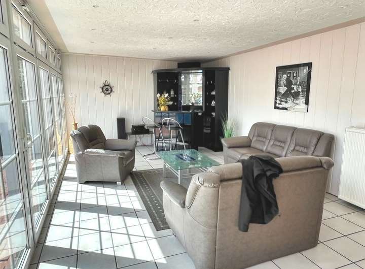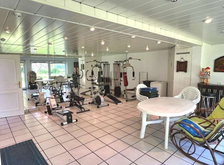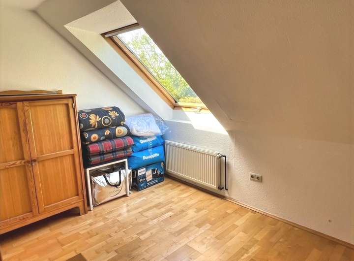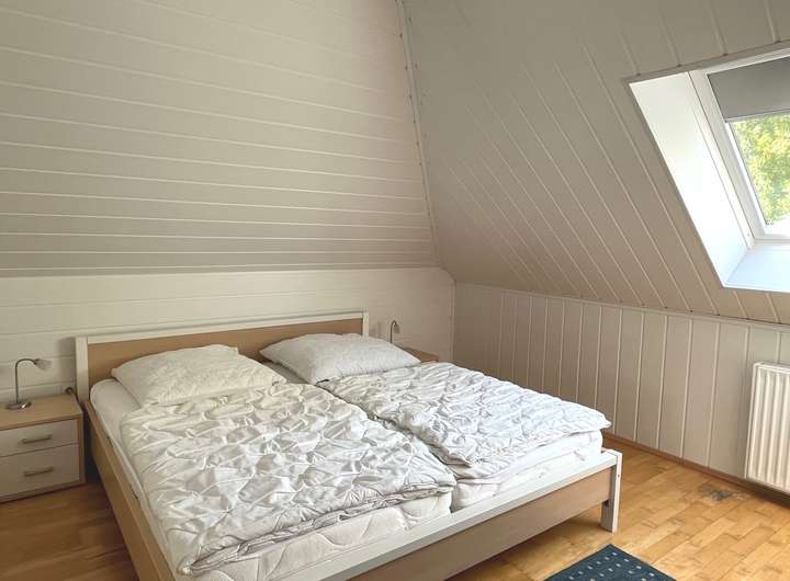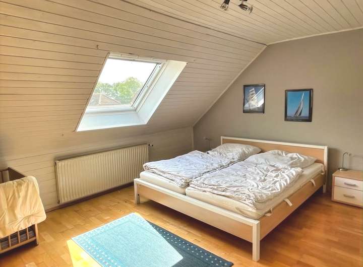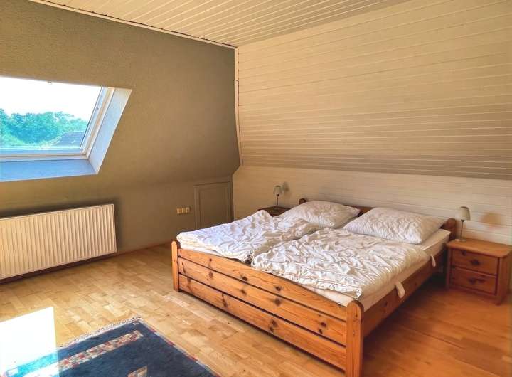 Im Erdgeschoss befinden sich Wohnzimmer, Schlafzimmer, Küche, Bad und Flur. Im Flachdachanbau befindet sich außerdem ein großer Hobbyraum (aktuell Fitnessraum und Sauna mit Duschen). Das Dachgeschoss bietet 3 weitere Schlafzimmer, einen Abstellraum/Büro und Badezimmer.