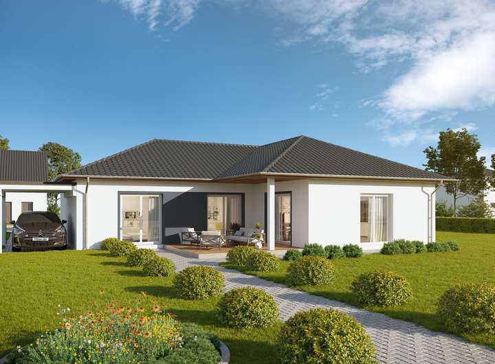 Bei allen vorliegenden Abbildungen und Fotografien handelt es sich um beispielhafte Darstellungen. Möblierungen und sonstige Einrichtungsgegenstände, Lampen, Außenanlagen, wie zum Beispiel Terrassen, Zuwegungen, Stellplätze, Carports, Pool und Gartenanlagen inkl. Bepflanzung sind nicht im Leistungsumfang enthalten. Der Leistungsumfang ergibt sich aus der jeweiligen individuellen Baubeschreibung des Hauses.