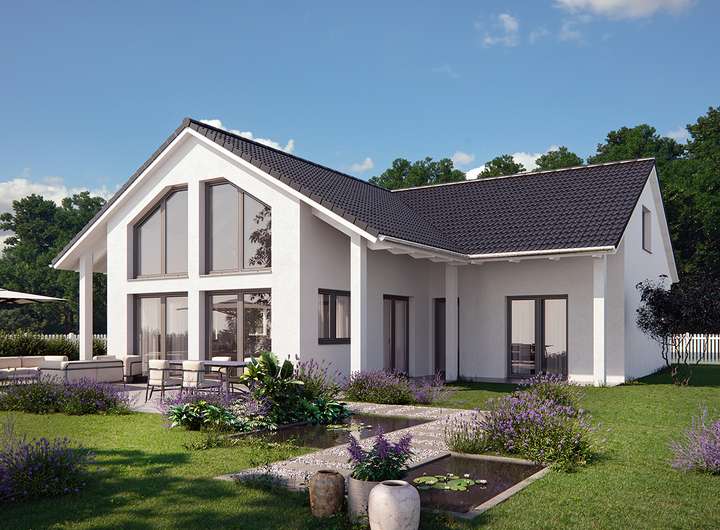Bei allen vorliegenden Abbildungen und Fotografien handelt es sich um beispielhafte Darstellungen. Möblierungen und sonstige Einrichtungsgegenstände, Lampen, Außenanlagen, wie zum Beispiel Terrassen, Zuwegungen, Stellplätze, Carports, Pool und Gartenanlagen inkl. Bepflanzung sind nicht im Leistungsumfang enthalten. Der Leistungsumfang ergibt sich aus der jeweiligen individuellen Baubeschreibung des Hauses.