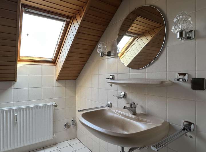 Das ausgebaute Dachgeschoss mit rund 88 m² Wohnfläche kann mit ein wenig Aufwand als eigenständige Wohneinheit genutzt werden. Es verfügt über drei Zimmer, eine Küche, ein Badezimmer sowie ein Durchgangszimmer, das sich beispielsweise als Esszimmer anbietet. Der Balkon lädt dazu ein, die ruhige Umgebung und den Blick ins Grüne zu genießen.