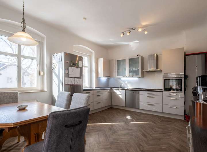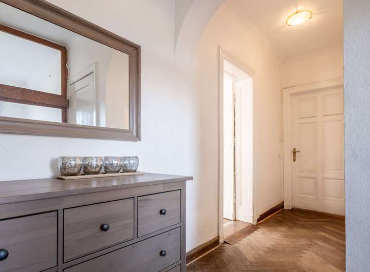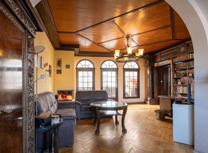 Die beeindruckende Raumhöhe von 3 Metern, Altbauelemente wie die Holzvertäfelung und das Kreuzgewölbe an der Decke des Wohnzimmers, die historischen Holz-Kassettentüren, der Terrazzoboden im Wintergarten und der originale Parkettboden im Obergeschoss geben dem Gebäude einen besonderen historischen Charme und Charakter.