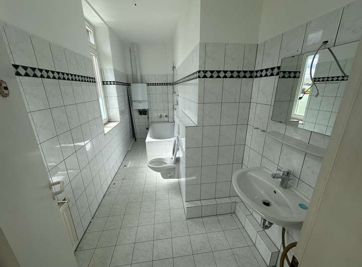 Das Badezimmer ist vollständig neu gefliest und mit modernen Armaturen sowie einem Waschbecken und einem WC ausgestattet.