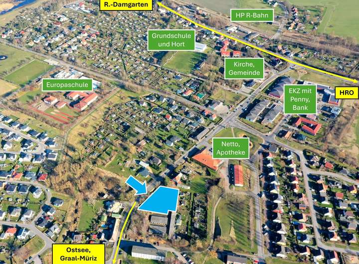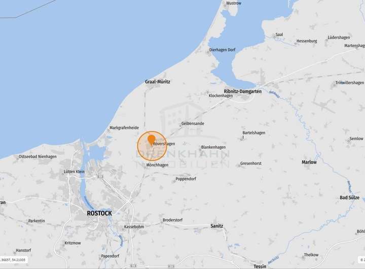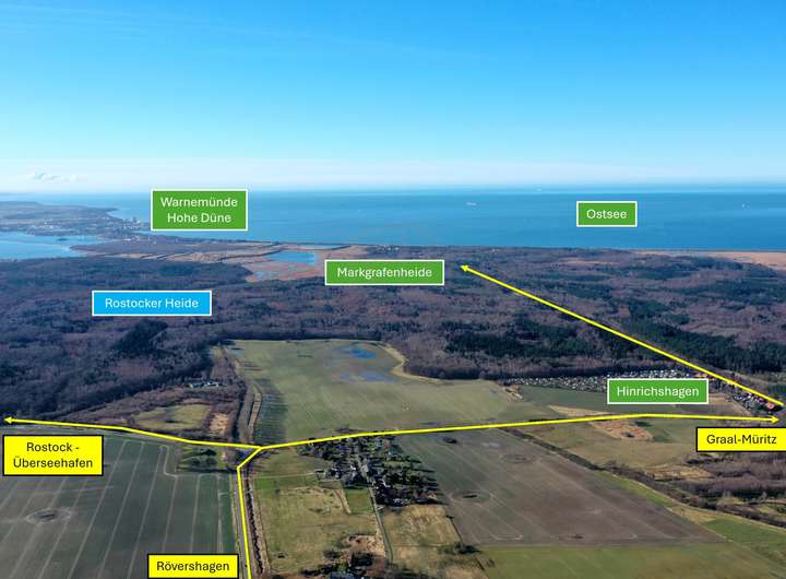 Die Gemeinde Rövershagen liegt im Landkreis Rostock, rund 15 Kilometer östlich der Hansestadt Rostock. Die Innenstadt ist in ca. 15 Autominuten erreichbar, die Ostseeküste in nur etwa 8 Minuten – eine ideale Kombination aus Nähe zur Stadt und naturnahem Wohnen.