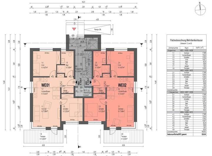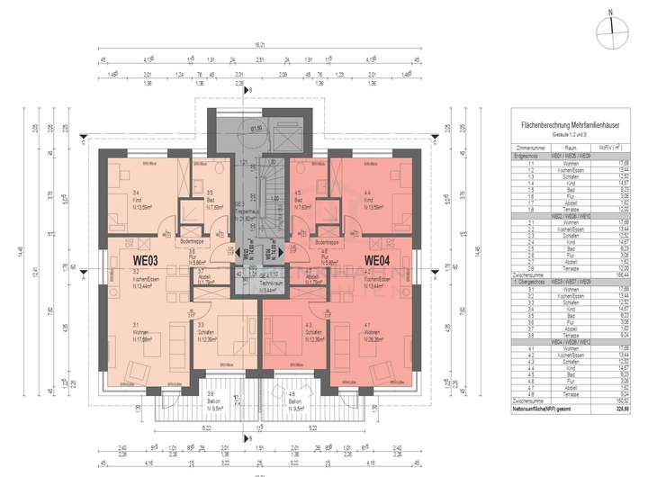 Das geplante Bauvorhaben umfasst ca. 1.369 m² Bruttogrundfläche (BGF) bzw. 980,88 m² Nutz- und Wohnfläche (NRF). Pro Baukörper sind zwei Vollgeschosse mit je zwei Wohneinheiten vorgesehen – eine ideale Grundlage für flexible Grundrissgestaltungen und wirtschaftliche Bauausführung.