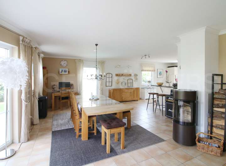- Im Erdgeschoss begeistert das Haus unter anderem mit einem sehr großen, offenen Koch-/Wohn- & Essbereich (ca. 59m²) , welcher – nicht zuletzt dank des Kamins – ein hohes Maß an Gemütlichkeit ausstrahlt. Auf dieser Etage befindet sich auch ein Duschbad.