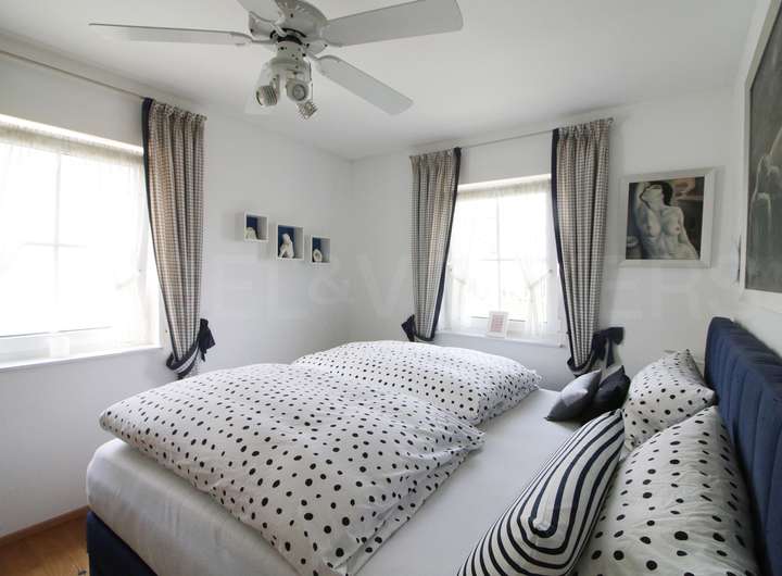 - Im Obergeschoss befinden sich drei Schlafzimmer (eins davon mit begehbarer Ankleide) und ein großes Badezimmer samt Dusche und Badewanne