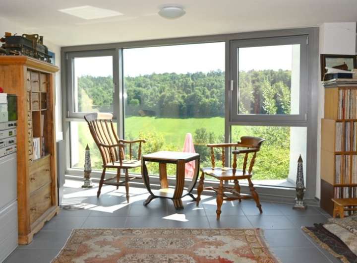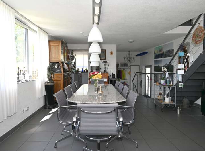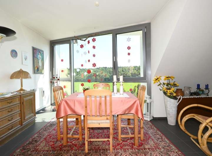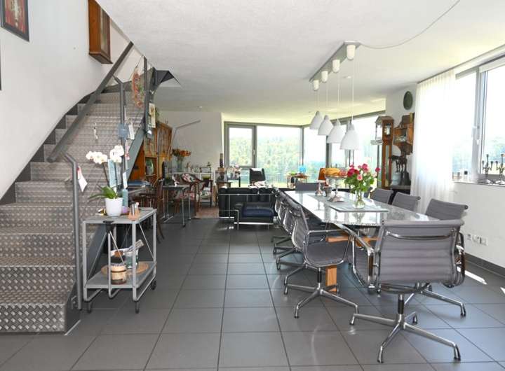 Das Herzstück des Hauses ist der beeindruckende, große Wohn-/Essbereich mit ca. 48 m², dessen über Eck verlaufender Erker dem Raum eine besondere architektonische Raffinesse verleiht.