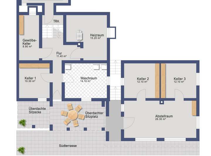 Diverse Neben- und Abstellräume, Wasch- und Trockenraum, Tankraum, Heizraum, 3 Kellerräume, Flur.