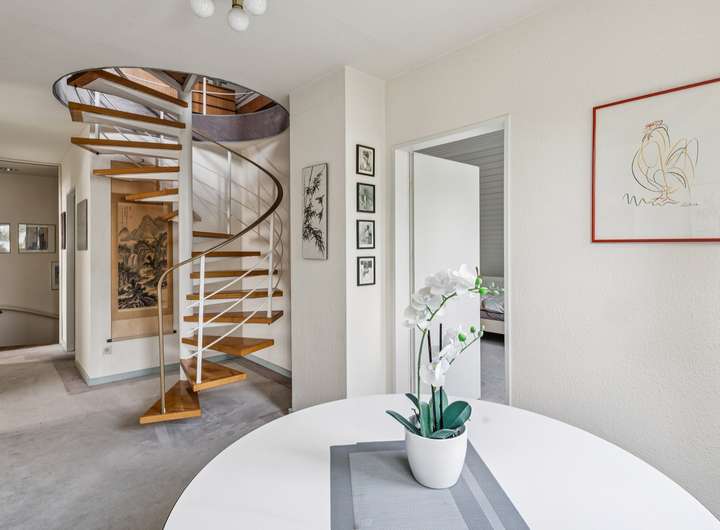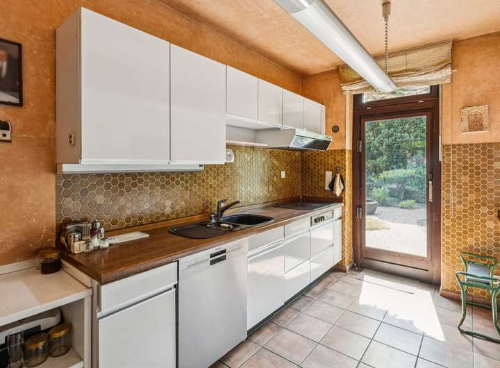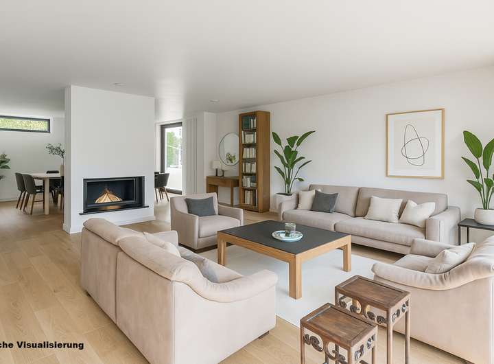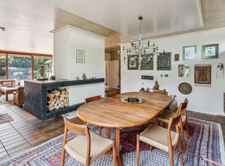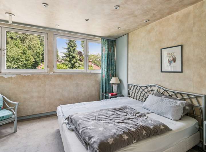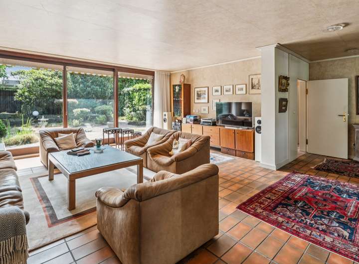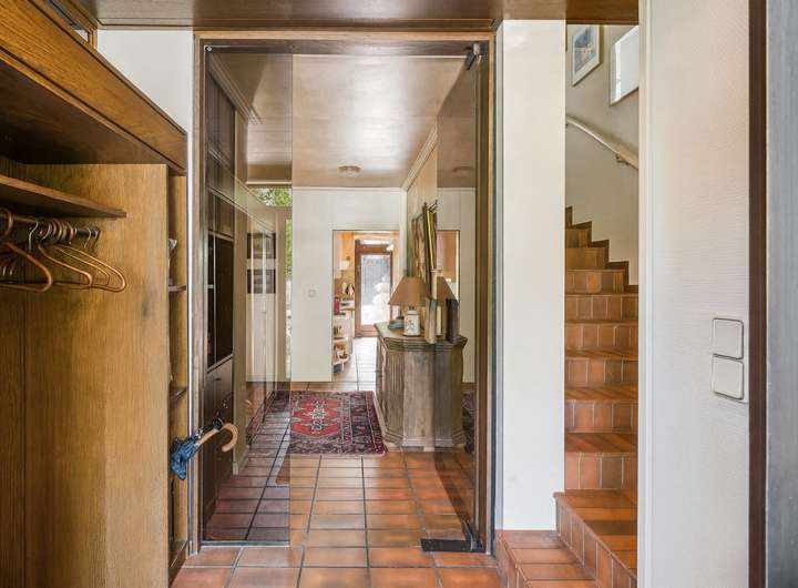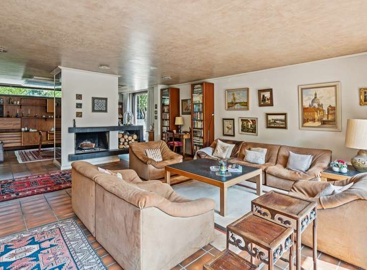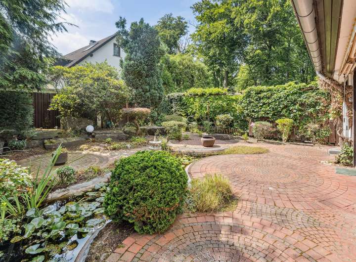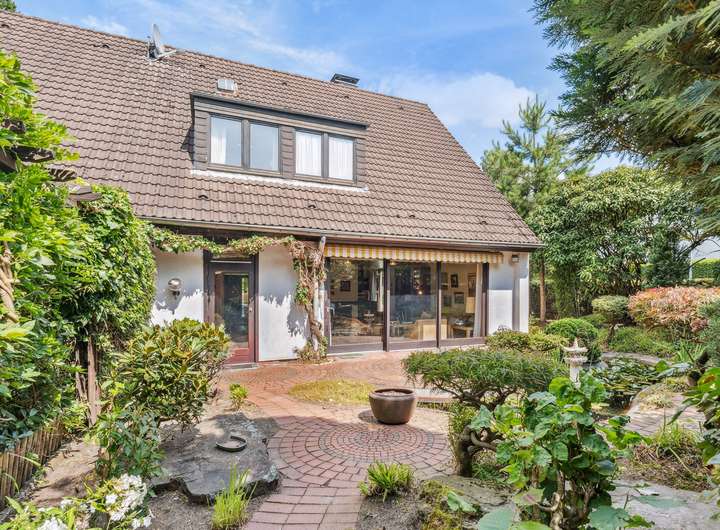 Das im Jahr 1974 erbaute Haus überzeugt durch eine harmonische Raumaufteilung über drei Etagen sowie eine breite Front von circa neun Metern, die dem Inneren eine beeindruckende Weitläufigkeit verleiht. Die offene Gestaltung des Wohn- und Essbereichs mit einem stilvollen Kamin schafft ein behagliches Ambiente und sorgt für eine helle und freundliche Wohnatmosphäre. Großzügige Fensterfronten verbinden den Wohnbereich mit der sonnigen Terrasse und dem japanisch inspirierten Garten, der mit seinem besonderen Flair Ruhe und Entspannung verspricht.