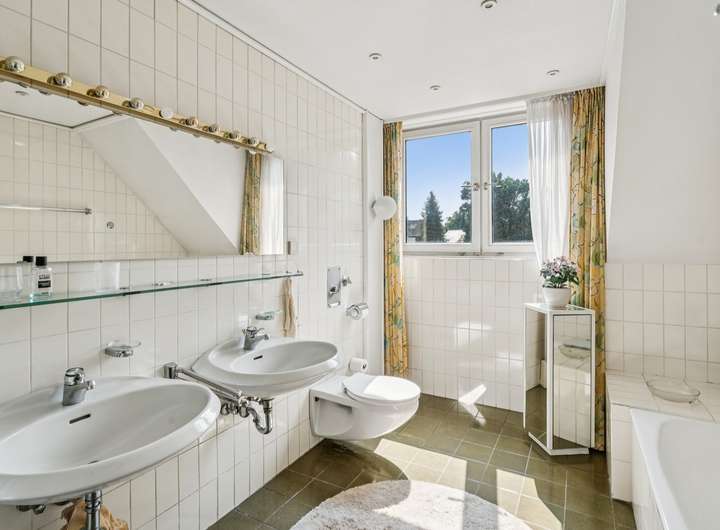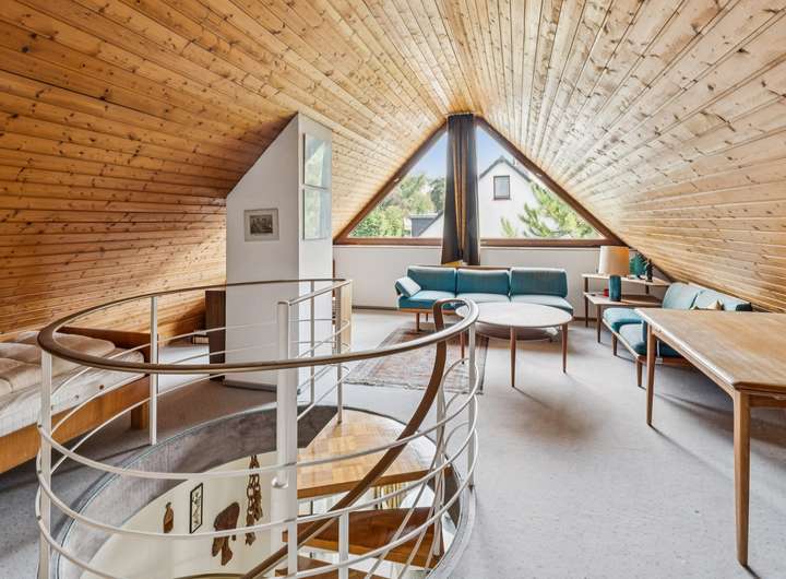 Im Obergeschoss befinden sich drei gut geschnittene Schlafzimmer sowie zwei Tageslichtbäder. Ein besonderes Highlight ist das ausgebaute Studio im Dachgeschoss, das sich ideal als Rückzugsort, Atelier oder Home-Office nutzen lässt. Die Vollunterkellerung eröffnet vielfältige Nutzungsmöglichkeiten mit reichlich Stauraum, einem separaten Hobbyraum sowie einer Sauna. Eine Garage direkt am Haus sorgt für komfortables Parken.