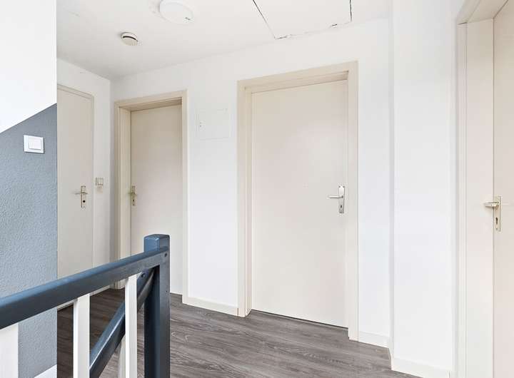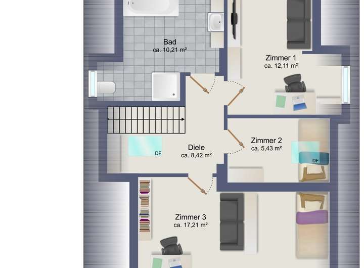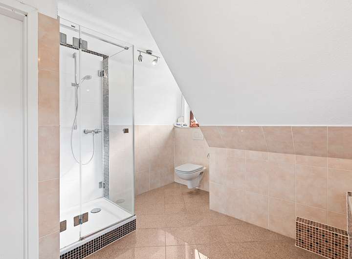 Auf dieser Etage befindet sich zudem ein modernes Vollbad, das mit einer Badewanne, einer separaten Duschkabine, WC, hochwertigen Armaturen und Handtuchheizkörper ausgestattet ist. Die geschickte Anordnung der Räume sorgt für eine optimale Nutzung des verfügbaren Platzes und bietet gleichzeitig Rückzugsorte für jedes Familienmitglied.