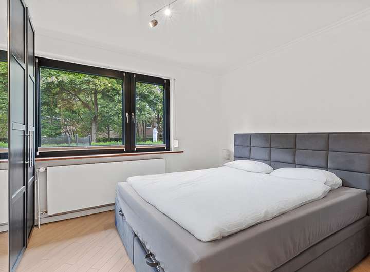 Empfangen wird man von einem großzügigen und dank großflächiger Verglasung lichtdurchfluteten Windfang, der einen freundlichen ersten Eindruck vermittelt und praktischen Stauraum bietet. Im Erdgeschoss befinden sich ein gut geschnittener Wohnraum mit Kamin, das großzügige Elternschlafzimmer, ein weiteres Zimmer (aktuell als Arbeitszimmer genutzt) sowie ein modernisiertes Badezimmer mit Duschkabine, WC, hochwertigen Armaturen und Handtuchheizkörper. Ein weiteres Highlight dieser Etage ist die voll ausgestattete Küche, die mit großzügigen Arbeitsflächen, modernen Einbaugeräten und einem kleinen Essplatz überzeugt – perfekt für das schnelle Frühstück oder die Kaffeepause zwischendurch.