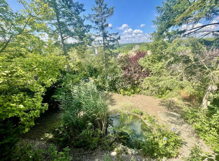 Der großzügige Garten ist liebevoll angelegt und besticht durch alte, hohe Bäume, die für eine beruhigende Atmosphäre und natürlichen Sichtschutz sorgen. Ein kleiner Teich rundet die Idylle ab. Auf Wunsch kann der Bewuchs zurückgeschnitten werden, um noch mehr Platz zu schaffen.