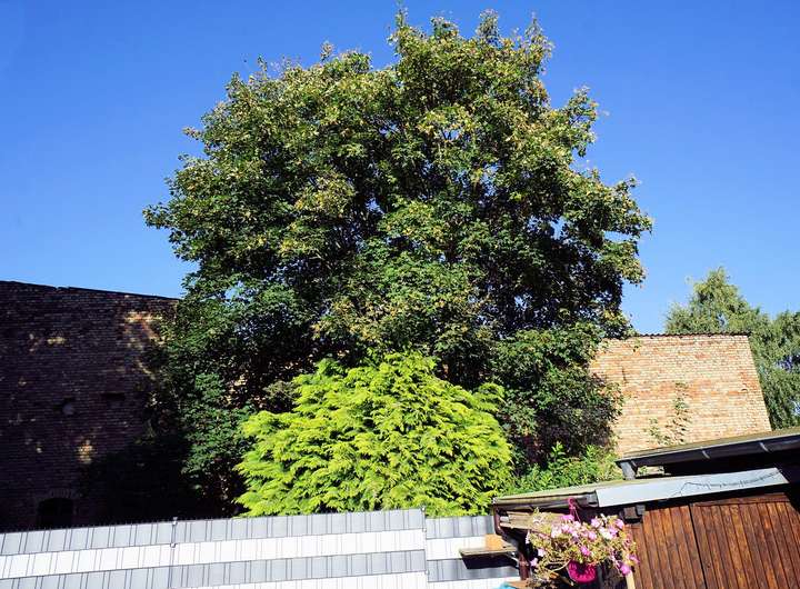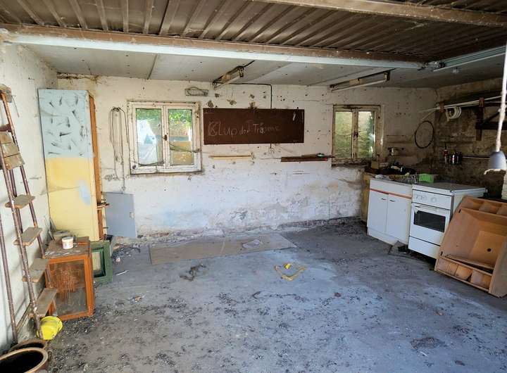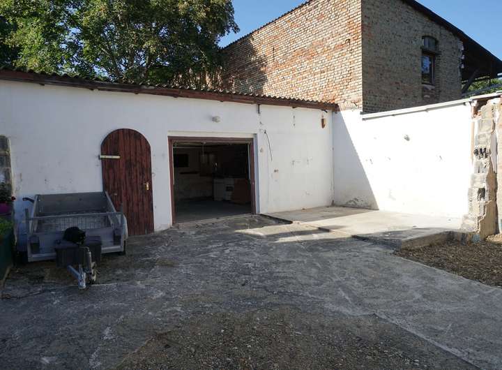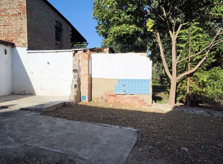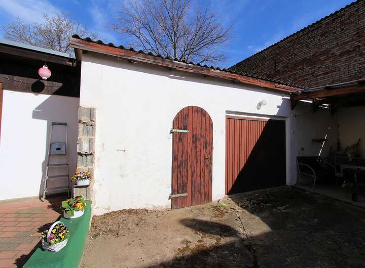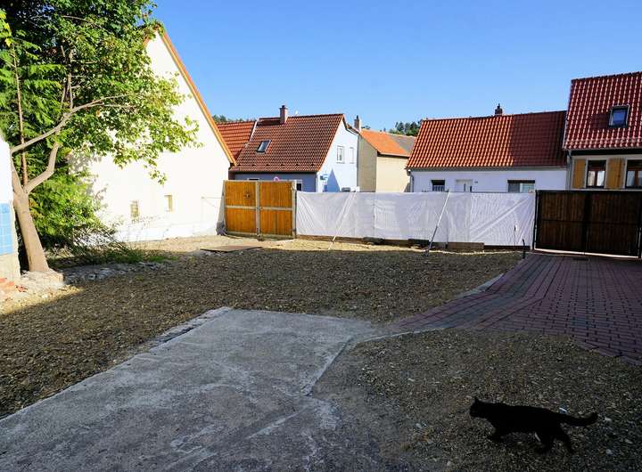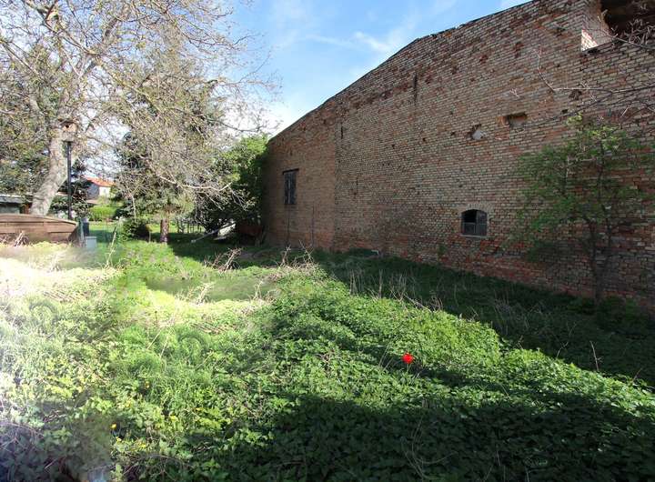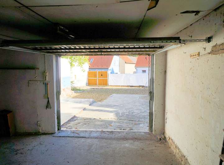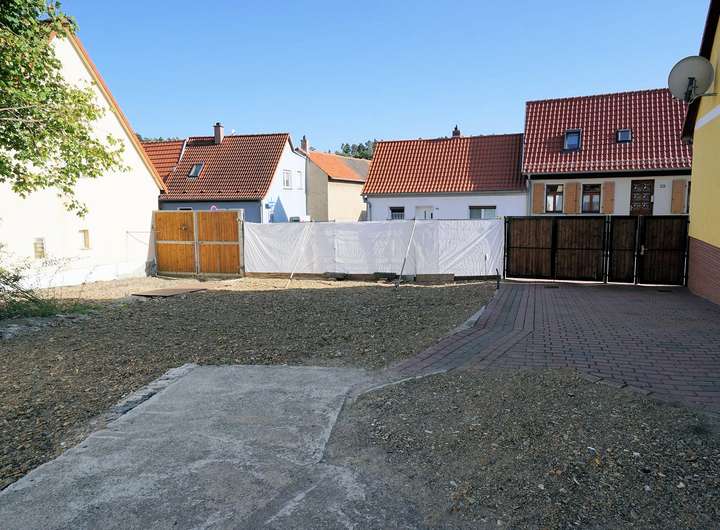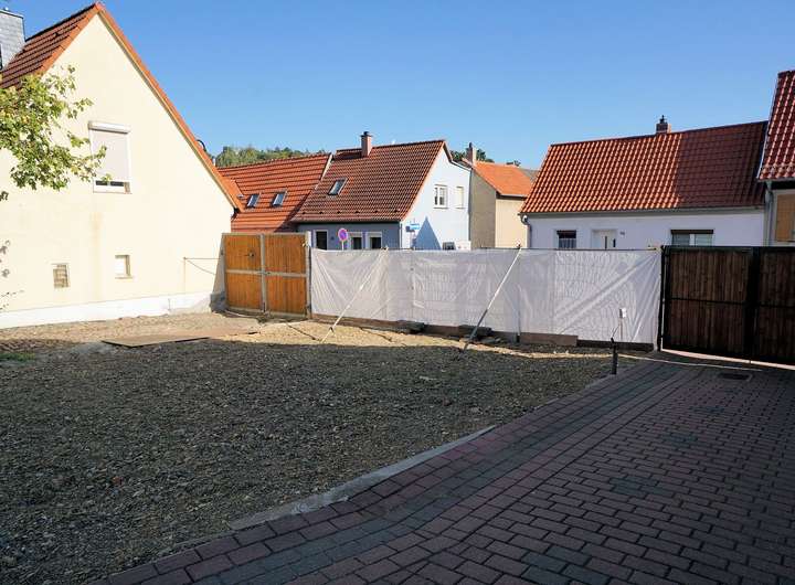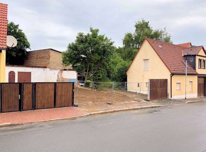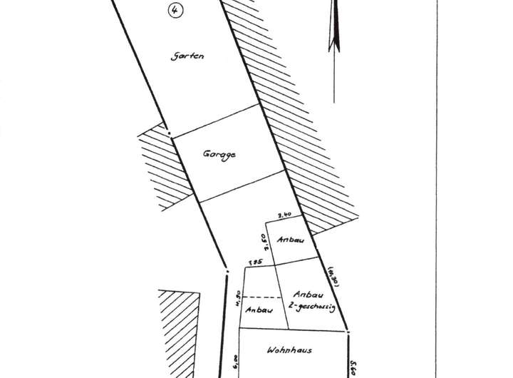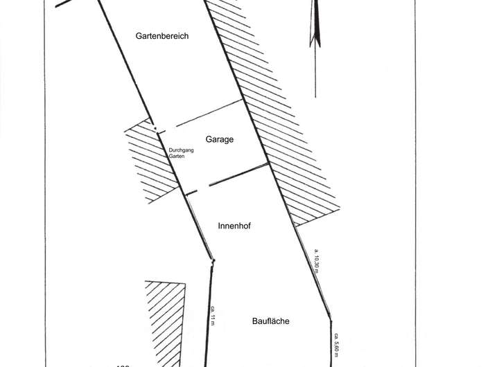 Grundstück: Das Grundstück hat eine Größe von ca. 356 m² ist unregelmäßig geschnitten und unterteilt sich in drei Bereiche. Auf dem vorderen Teil des Grundstücks mit ca. 170 m² stand ein kleines Wohnhaus mit Anbauten mit ca. 85 m² Wohnfläche, das im Auftrag der Eigentümerseite in diesem Jahr abgerissen wurde. Die bebaute Grundfläche betrug ca. 100 m². Im mittleren Grundstücksbereich steht eine massive Garage, sie ist ca. 18 m von der Straßenfront entfernt. Sie hat eine Grundfläche von ca. 49 m², die sich in die Garage mit ca. 34 m² und einen kleinen Nebenraum mit ca. 15 m² mit Durchgang zum Garten unterteilt. Dahinter schließt sich ein Gartenteil mit einer Größe von ca. 137 m² an. Das Grundstück verschwenkt sich nach ca. 10 m auf der linken Seite nach links. Auf der rechten Seite verschwenkt es sich nach ca. 6 m nach links. Die Straßenfront hat eine Breite von ca. 11 m, mittig ist das Grundstück ca. 8,20 m breit und am hinteren Ende ca. 8,50 m. Es ist auf der linken Seite ca. 36 m und auf der rechten Seite ca. 40 m tief. Zur Straße hin steh im Moment ein Bauzaun. Der Innenhof wird durch die Garage vom dahinterliegenden Garten getrennt. Der Garten ist verwildert.