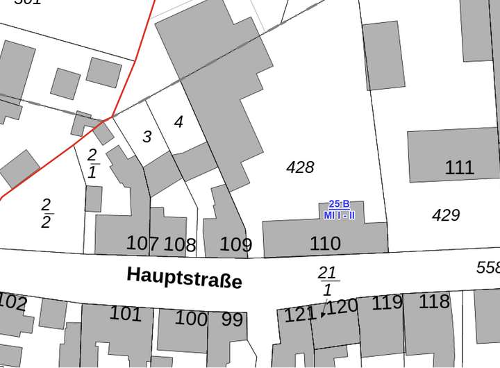Erschließung: Auf dem Grundstück liegen Gas, Strom, Telefon, Trink- und Abwasser an. Es gibt aufgrund der Grundstückslage und der ehemaligen Bebauung eine gemeinsame Grundstückszufahrt mit dem linken Nachbarn. Dies Zufahrt wurde gemeinsam mit dem Nachbarn baulich neu angelegt. Das Grundstück ist laut Flächennutzungsplan von 2006 als allgemeines Wohngebiet deklariert. Im Entwurf zum neuen Flächennutzungsplan von 2024 soll der Bereich, in dem das Grundstück liegt, als gemischte Baufläche ausgewiesen werden. Gebaut werden kann nach §34 BauGB. Die GRZ beträgt 0,6 und die GFZ 1,2.