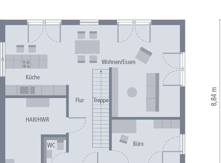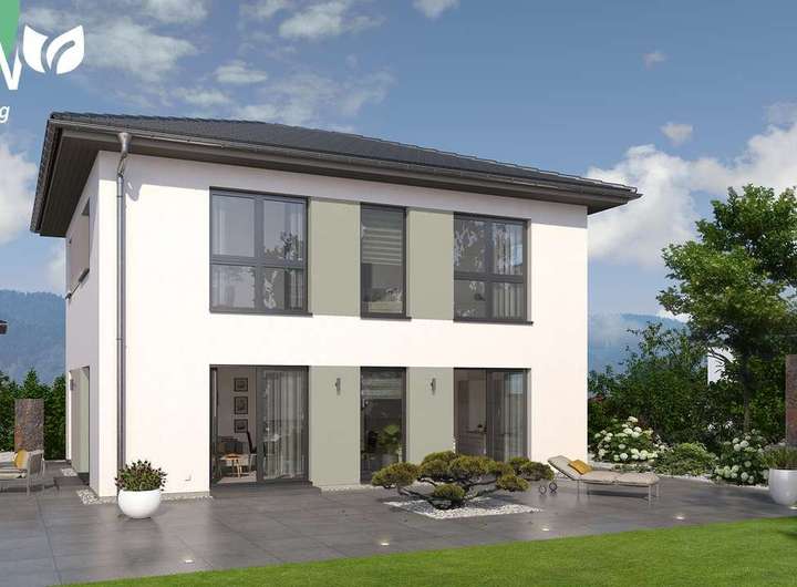 Ein Walmdach, das verkörpert Eleganz und vermittelt einen edlen, fast schon herrschaftlichen Eindruck. So auch bei unserer Stadtvilla 10 mit Walmdach. Das große Plus: Dank dieser Dachform gibt es im Obergeschoss keine Dachschrägen und damit zahlreiche Möglichkeiten zum Positionieren der Möbel. Doch diese Stadtvilla kann noch mit vielen weiteren kleinen und großen Ausstattungs- und Grundrissdetails punkten. So gibt es im ca. 78 m² großen Erdgeschoss eine räumliche Zweiteilung: die Zimmer zum Entspannen und Zusammenkommen auf der Gartenseite, die funktionellen Räume auf der, der Straße zugewandten, Seite. Konkret bedeutet das: vom großen Wohn-Ess-Koch-Bereich ist der direkte Zugang auf die Terrasse und damit ins Grüne möglich. Büro, Hauswirtschaftsraum sowie Gäste-WC sind unterdessen gegenüberliegend und unmittelbar aus der Diele zugänglich. Im Obergeschoss befinden sich neben dem Reich der Eltern zwei identisch große Kinderzimmer sowie ein geräumiges Bad mit Wanne, Dusche und WC.