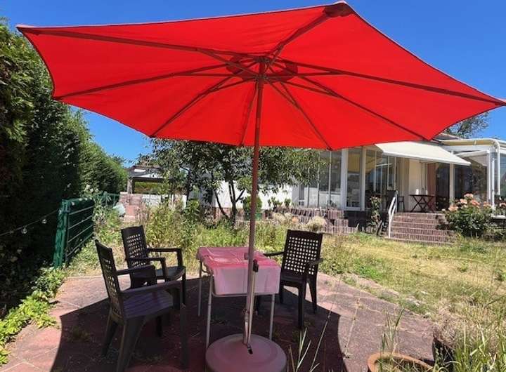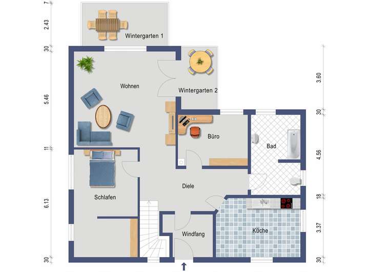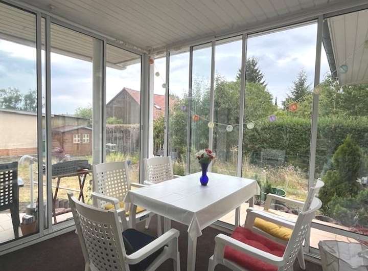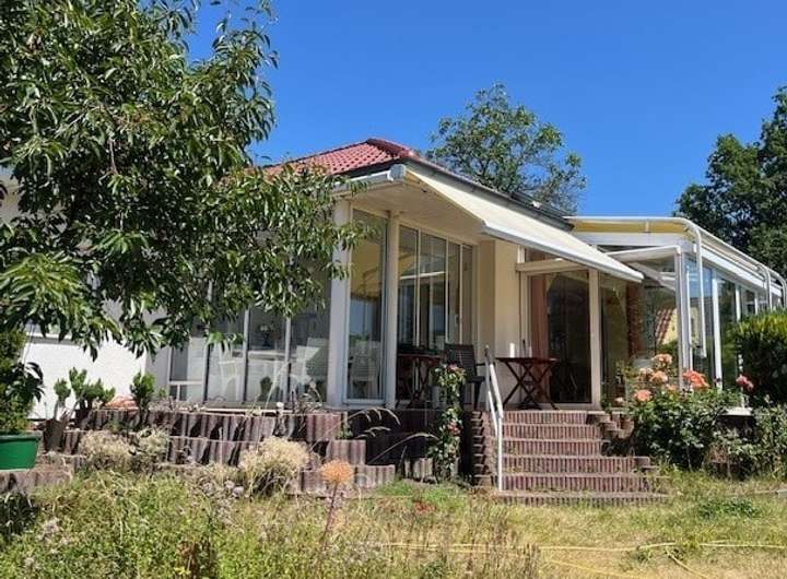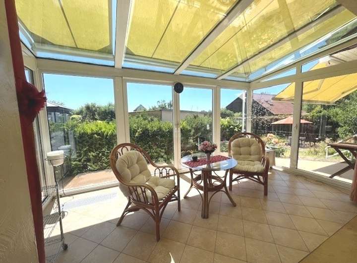 Im Erdgeschoss befindet sich das helle lichtdurchflutete Wohnzimmer mit zwei anschließenden beheizbaren Wintergärten, ein Schlafzimmer, ein Büro/Kinderzimmer sowie ein Badezimmer mit Badewanne und Dusche und eine große Wohnküche.