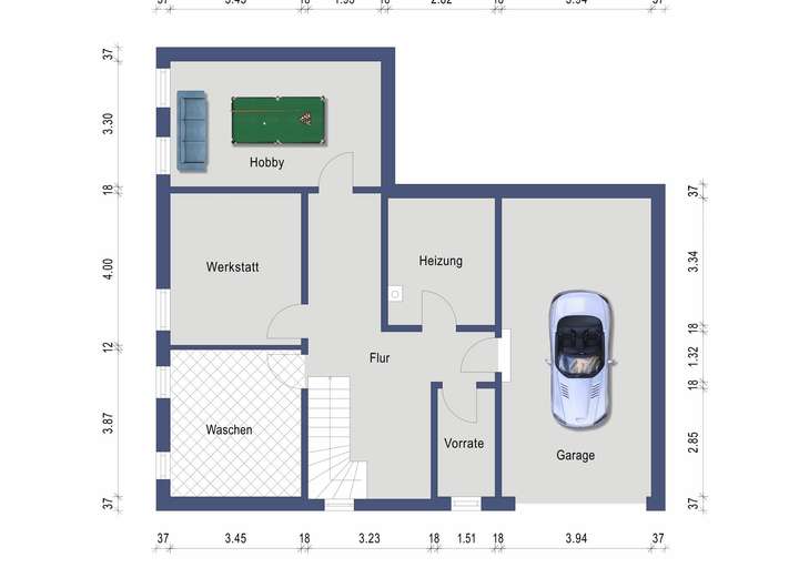 - Kellergeschoss: Heizkörper und mechanische Rollläden