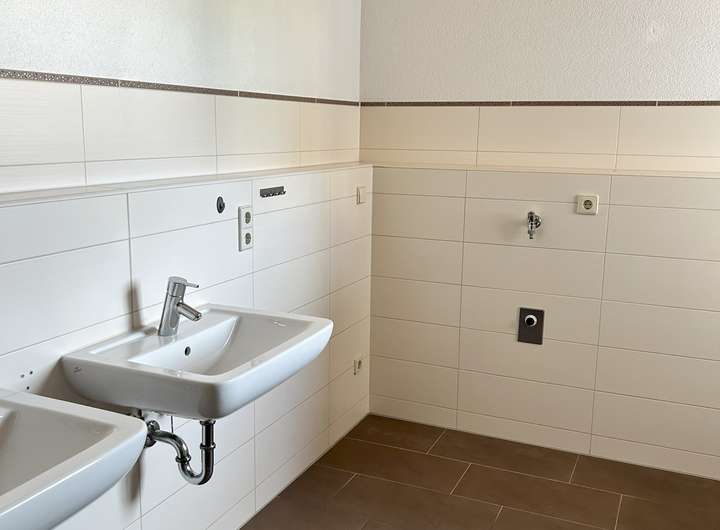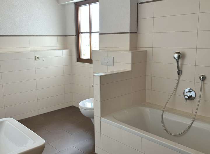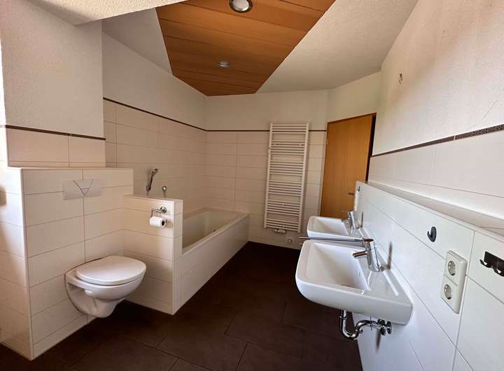 Das moderne Badezimmer ist mit einer Badewanne, 2 Waschbecken und einer Toilette ausgestattet. Die Waschmaschine können Sie hier ebenfalls anschließen.