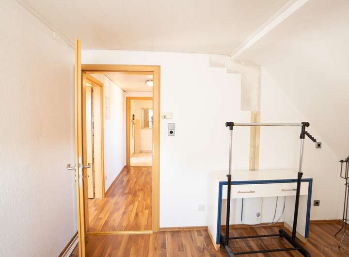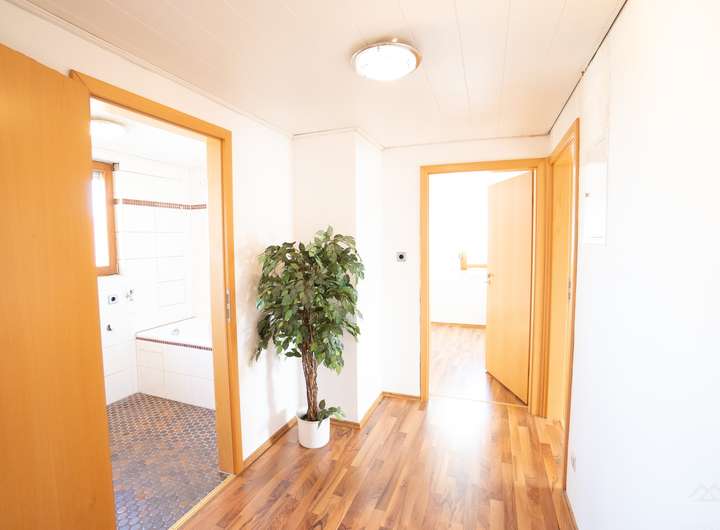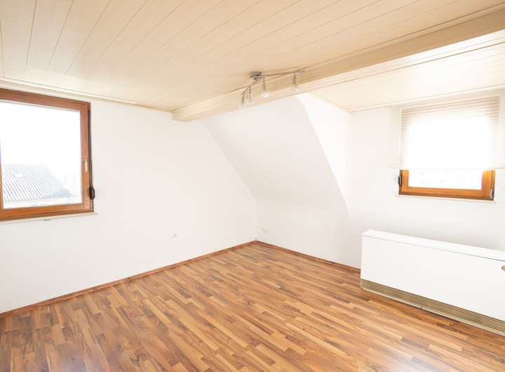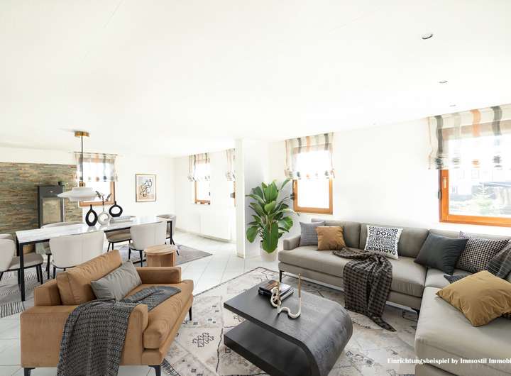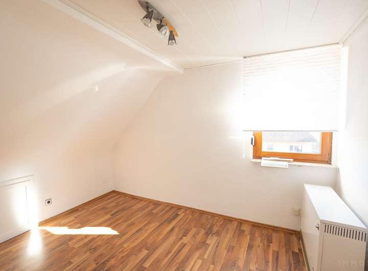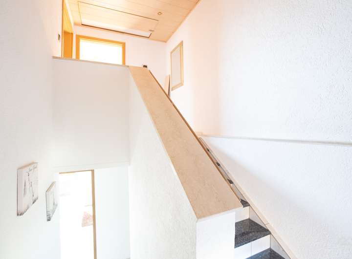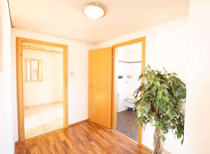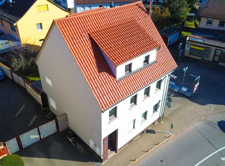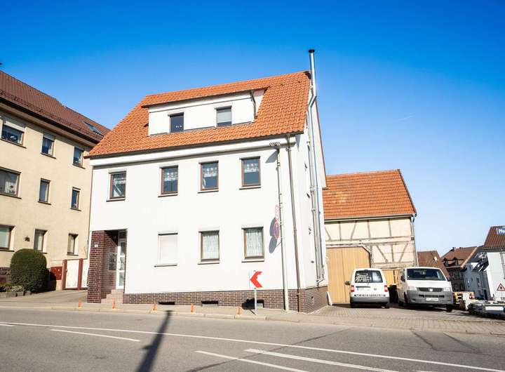 Im Erdgeschoss befindet sich eine 2-Zimmer-Wohnung, die sich ideal als Büro oder Mitarbeiterwohnung nutzen lässt. Das Ober- und Dachgeschoss wurden zu einer großzügigen 4-Zimmer-Hauptwohnung zusammengelegt und bieten ausreichend Platz für die Familie.