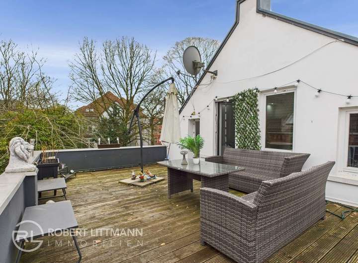 Ein besonderes Highlight stellt das vollständig ausgebaute Dachgeschoss dar. Hier eröffnet sich ein eigenständiger Wohnbereich mit gemütlichem Wohnzimmer, moderner Küche, einem eleganten Badezimmer und zwei ruhigen Schlafzimmern. Die angeschlossene Dachterrasse rundet dieses Geschoss perfekt ab und bietet einen privaten Rückzugsort mit Ausblick über die Dächer der Stadt.