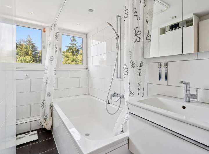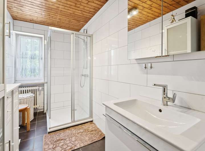 * Bad DG: Dusche, Waschtisch, komplett gefliest, Tageslicht