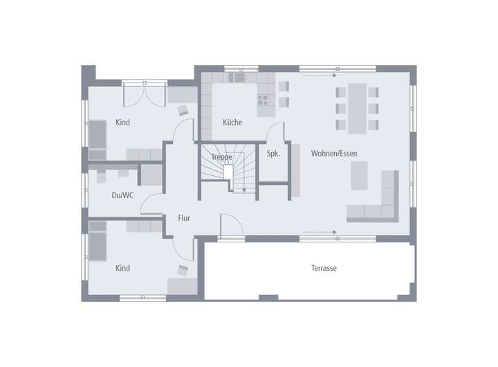 Unser Designhaus im Berg ist für die besonders anspruchsvolle Umgebung konzipiert und fügt sich auf elegante und zugleich durchdachte Weise ideal in hügeliges Gelände ein. Das Einfamilienhaus erstreckt sich über zwei Etagen und ist bereits von außen ein echter Blickfang: Auf der dem Berg abgewandten Seite befindet sich im Untergeschoss eine Garage sowie - unmittelbar darüber - ein überdachter Balkon, der die Fassade nicht nur optisch aufwertet, sondern auch für einen wohnlichen Mehrwert sorgt: Hier können die künftigen Eigenheimbesitzer vor fremden Blicken geschützt entspannen. Doch auch unter dem Satteldach hat das Designhaus auf einer Wohnfläche von rund 222 m² viel zu bieten. Im Kellergeschoss, das zugleich auch attraktiven und klimatisch immer angenehmen Wohnraum bietet, befindet sich das Reich der Eltern. Diese verfügen über ein Schlafzimmer mit Ankleide sowie ein Badezimmer. Auf der gegenüberliegenden Seite des zweigeteilten Kellers befinden sich Garage und Nutzräume. Mittelpunkt des Erdgeschosses ist der mehr als 45 m² große Wohn-Ess-Koch-Bereich mit einer sich unmittelbar anschließenden Speisekammer und direktem Zugang zum Balkon, zwei Kinderzimmern und einem Duschbad.