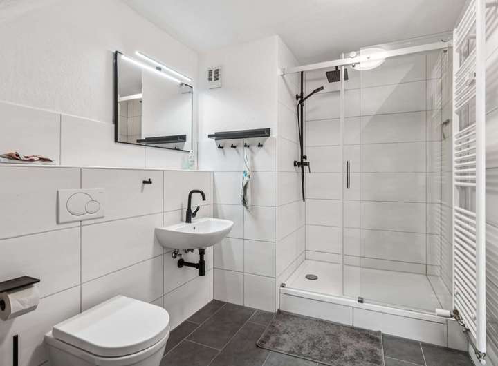 Die Ausstattung der Wohnungen umfasst eine Kombination aus Fliesen- und Teppichböden, was eine angenehme Wohnatmosphäre schafft. Ein Aufzug sorgt für komfortables Erreichen aller Etagen – besonders vorteilhaft für ältere Bewohner oder Familien mit Kindern. Ein praktischer Abstellraum sowie ein Gäste-WC bieten zusätzlichen Komfort.
