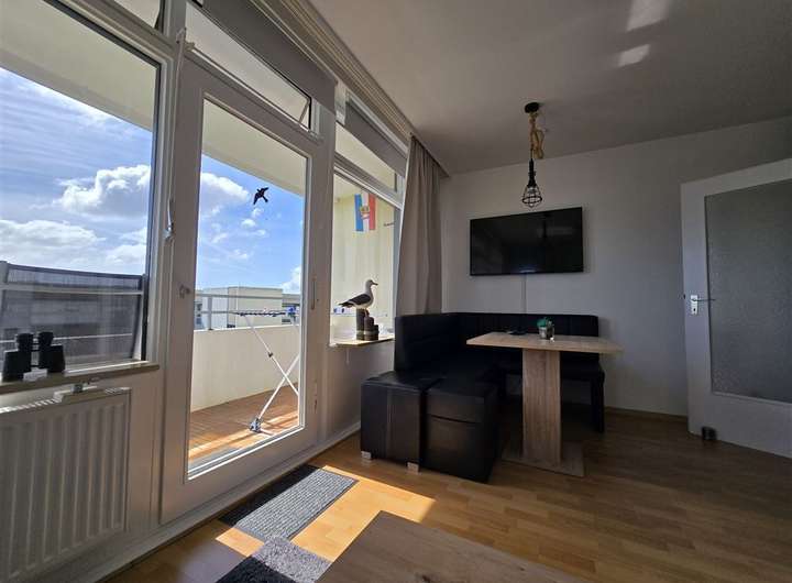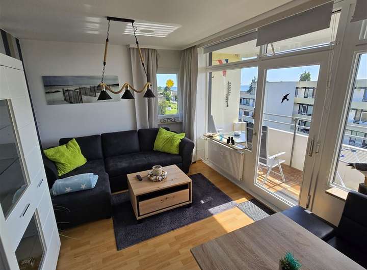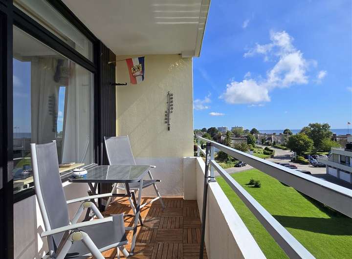 Vom Wohnzimmer gelangen Sie auf den möblierten mit Holzboden ausgestatteten Südbalkon auf dem Sie von morgens bis nachmittags die Sonne sowie den seitlichen Meerblick genießen und dem Meeresrauschen lauschen können.