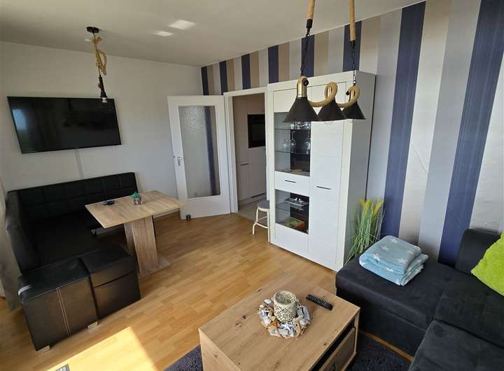Zur weiteren Ausstattung gehören ein großer Esstisch im Wohnzimmer, ein gemütliches Polstersofa im Wohnbereich sowie ein großer Flachbildfernseher.