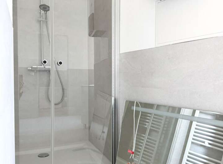 -Tageslichtbad mit Dusche und WC, Waschtisch und Spiegel vorhanden