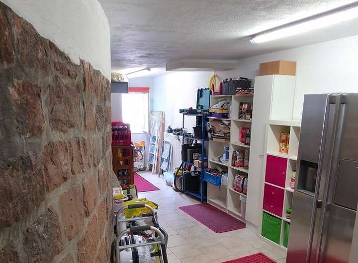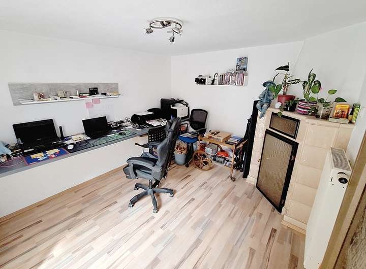 Die Raumaufteilung ist wie folgt: Der Hauseingang befindet sich in der Mitte der beiden Gebäudeteile. Im Inneren des Hauses finden Sie rechter Hand den Anbau mit Zugang über einen kleinen Vorraum zur Küche sowie zu einem weiteren Raum, der beispielsweise als Schlafzimmer einsatzfähig ist. Im hinteren Teil des Anbaus gibt es einen Abstell- und Vorratsraum mit integriertem Hauswirtschaftsbereich. Das innenliegende Bad grenzt daran an. Vom Hausflur aus erreichen Sie linker Hand das Wohnzimmer und ein weiteres Zimmer (aktuell Büro) mit Ausgang zu einer Terrasse. Die untere Terrasse bietet Sitzgelegenheit bei jedem Wetter und einen uneingeschränkten Blick in den ebenen Gartenanteil mit Pool.
