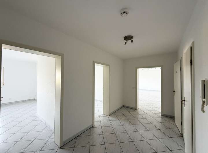 - Fliesenboden in der gesamten Wohnung (weiß/grau-meliert)