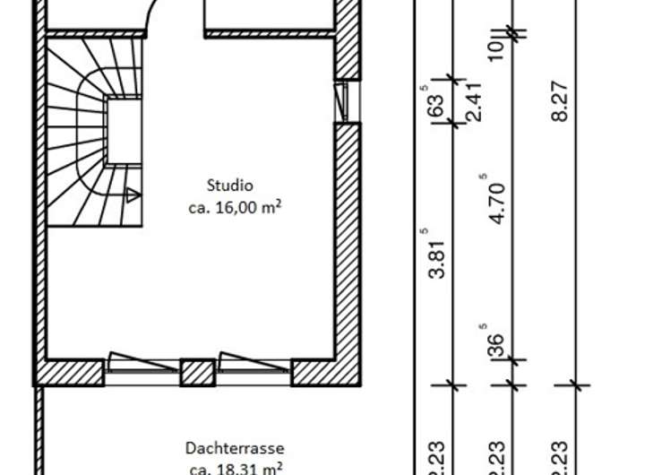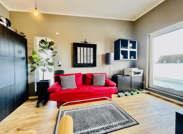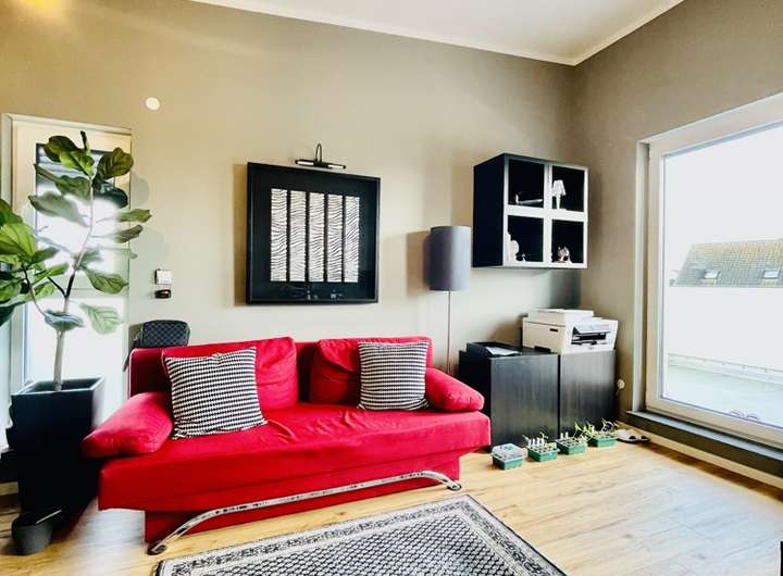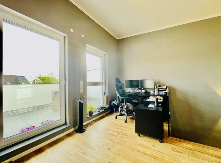 Das Dachgeschoss beheimatet ein Studio sowie ein weiteres Tageslichtbad mit Badewanne und Dusche. Das Studio eignet sich ideal als Arbeitsbereich und bietet Zugang zur großzügigen Dachterrasse, die einen herrlichen Blick ins Grüne ermöglicht.
