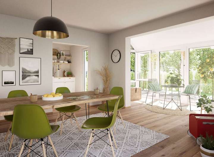 Das großzügige Haus mit dem schönen Satteldach überzeugt mit viel Platz und einem variablen Grundriss. Das Wohnzimmer schenkt genügend Raum zur Erholung, die sich anfügende Essecke wird schnell zum gemütlichen Familienmittelpunkt mit direktem Zugang zur Küche. Die hohen Fenster fangen das Tageslicht besonders gut ein. Jeder Raum im Haus wirkt offen und freundlich. Ein Arbeits- oder Kinderzimmer und das Gäste-WC runden das Erdgeschoss perfekt ab.