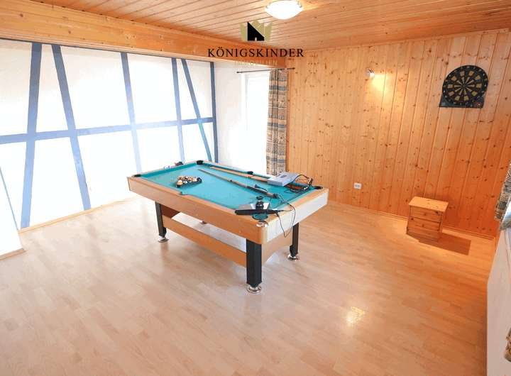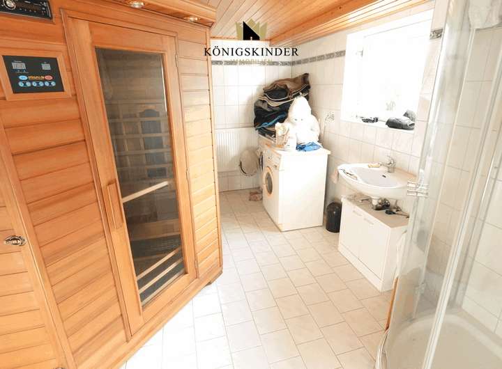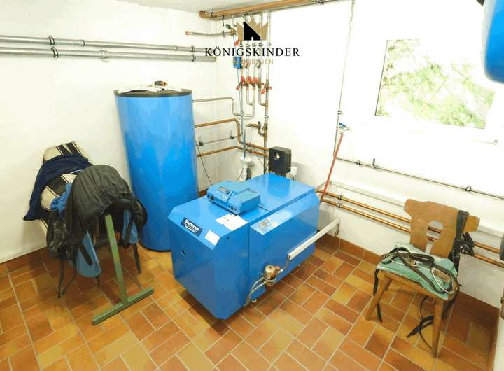 Im direkt angebauten Nebengebäude befindet sich eine Werkstatt, Lagerraum, ein Partyraum mit Bar. Hier wurde bereits ein neuer Verteilerkasten installiert, damit auch das noch nicht fertige Dachgeschoss angeschlossen werden kann, liegt bereits ein Kabel nach oben. Neueren Baujahres sind die Öl-Zentralheizung (Baujahr 2004), die Kunststofftanks für das Heizöl, die Fenster und das hier eingebaute Bad mit Sauna.