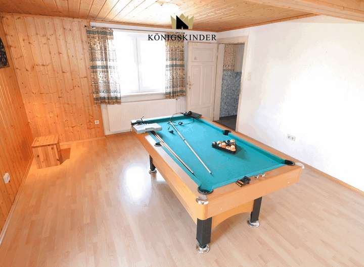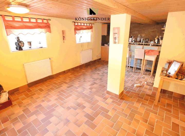Auf der rechten Seite befindet sich ein Nebengebäude, das neben einer kleinen Werkstatt und Lagerraum, einen Party- bzw. Veranstaltungsraum, sowie ein Badezimmer mit Sauna im Erdgeschoss. Über eine Außentreppe gelangt man in die vorbereitete Ausbaureserve im Dachgeschoss, in der bis zu 80 qm zusätzlichem Wohnraum entstehen können.