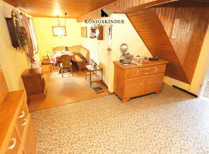 Das etwas erhöht liegende Erdgeschoss (Hochparterre) betritt man über eine vorgebaute Treppe mit breitem Zugang. Von der Diele aus gelangt man direkt in die Küche und das Esszimmer, geradezu geht es in einen Flur der zum Garten führt, hier ist auch das erste Bad mit Wanne/Dusche und WC untergebracht, es stammt aus den 60/70er Jahren.