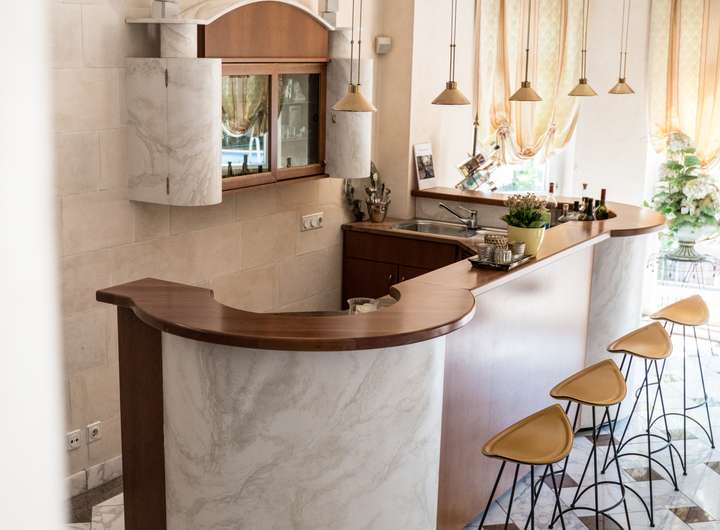 Der Wohnbereich erstreckt sich über zwei Ebenen und vermittelt durch Natursteinbeläge, polierten Granit, edle Kirschholztüren, eine integrierte Bar und einen offenen Kamin eine warme und zugleich luxuriöse Atmosphäre. Die hochwertig ausgestattete Küche bietet optimale Bedingungen für die Zubereitung anspruchsvoller Menüs und ist auf kulinarischen Genuss ebenso ausgerichtet wie auf funktionalen Komfort.