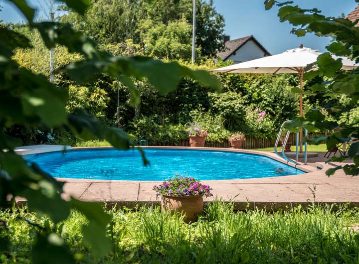 Der Außenbereich überzeugt durch seine sorgfältige Gestaltung und die kontinuierliche Pflege durch einen Gärtner. Vor dem Wohnzimmer erstreckt sich eine großzügige Terrasse mit beheiztem Schwimmbad und integrierter Gegenstromanlage, die zu Entspannung und sportlicher Betätigung gleichermaßen einlädt. Die beheizte Doppelgarage mit elektrisch gesteuerten Rolltoren ist direkt an das Wohngebäude angebaut und ermöglicht höchsten Komfort.